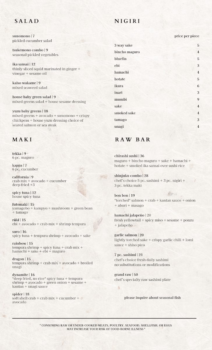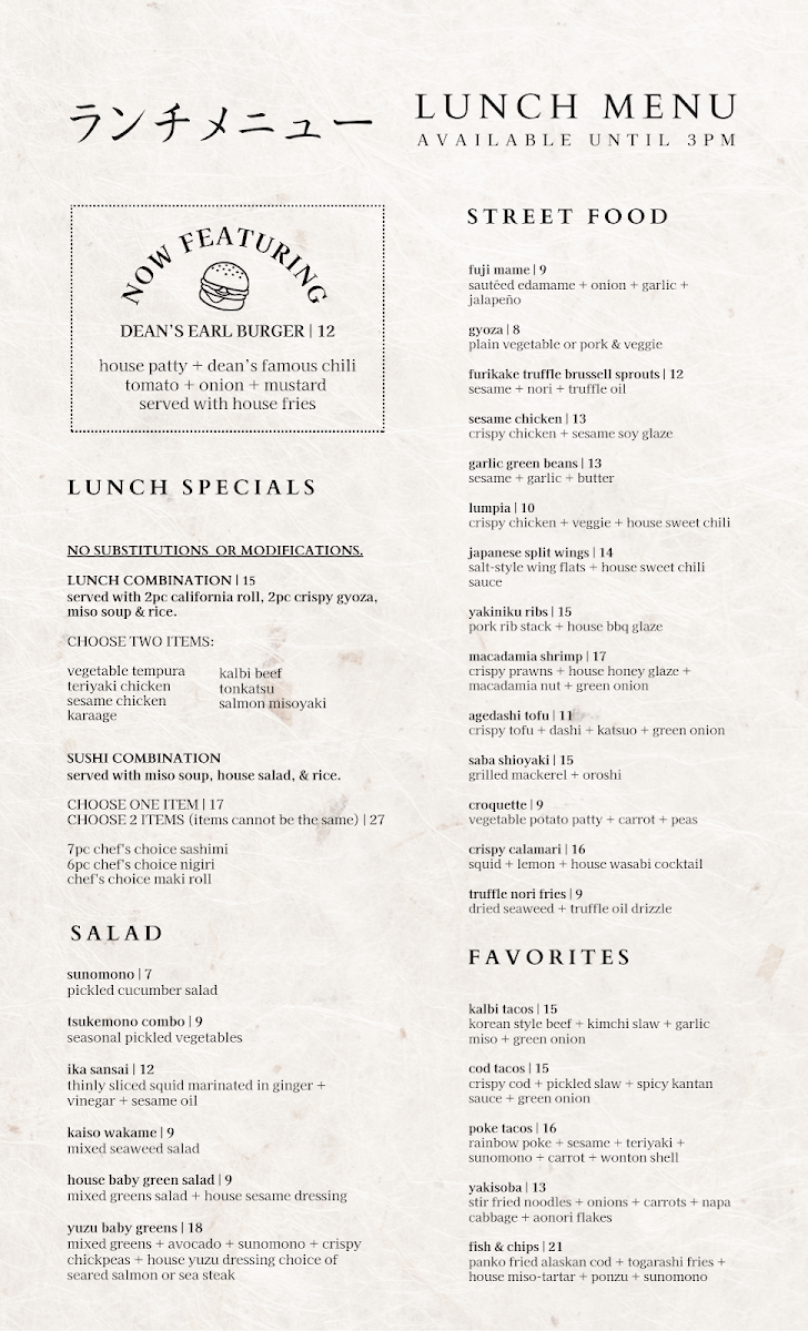 mixed greens + avocado + sunomono + crispy chickpeas + house yuzu dressing choice of seared salmon or sea steak